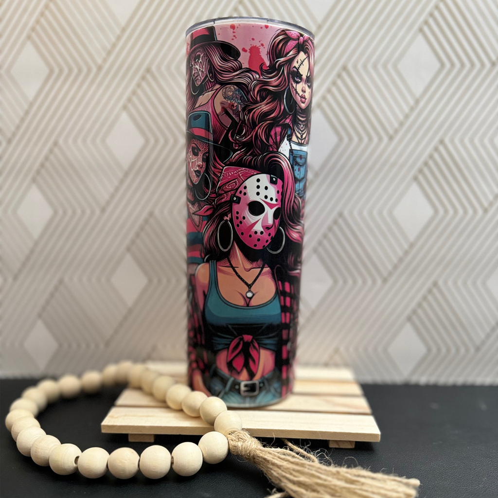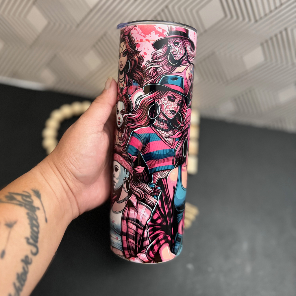 So why wait? Treat yourself or gift it to a fellow horror enthusiast. Grab your Pink Horror Girls Tumbler today and make every drink a thrilling experience!